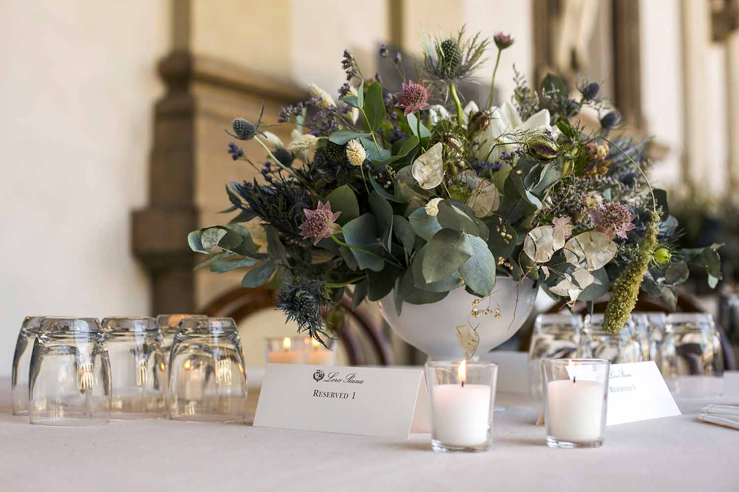 Il tutto decorato con piante e fiori dall’aspetto impervio, solo apparentemente trascurato, per restituire l’effetto sauvage, come da richiesta iniziale: cardi, limonium , lunaria, achillea , eucalipto, astrantia.